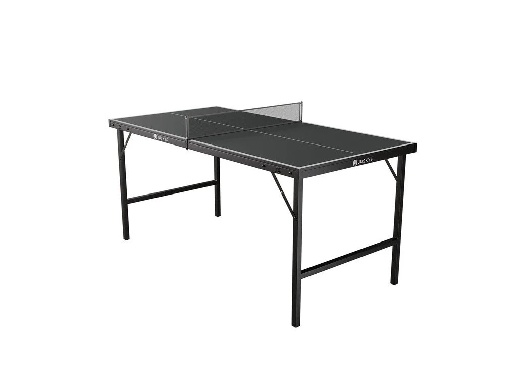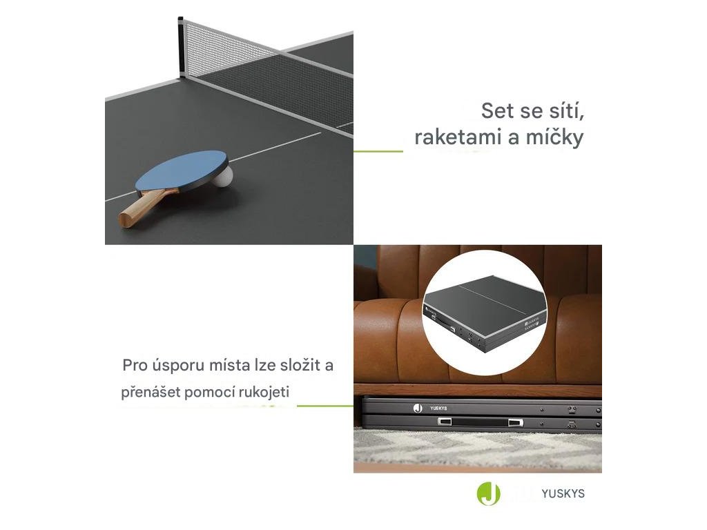 Užijte si dynamickou hru kdekoli s mini stolním tenisovým stolem v elegantním černo-stříbrném provedení. Tento praktický, skládací stůl včetně příslušenství je ideální do interiéru i do krytých venkovních prostor. Jeho praktický kufrový design umožňuje snadné složení a přenášení, proto jej jednoduše rozložíte v obývacím pokoji, dětském pokoji nebo na terase. Stačí otevřít desku a můžete okamžitě začít hrát s rodinou či přáteli. S pevným ocelovým rámem a stabilními nožičkami nabízí optimální oporu při hře, zatímco hrací plocha z MDF s PVC povrchem zaručuje plynulý odraz míčku. Souprava obsahuje síť, pálky na stolní tenis a 5 míčků.Technické specifikace: