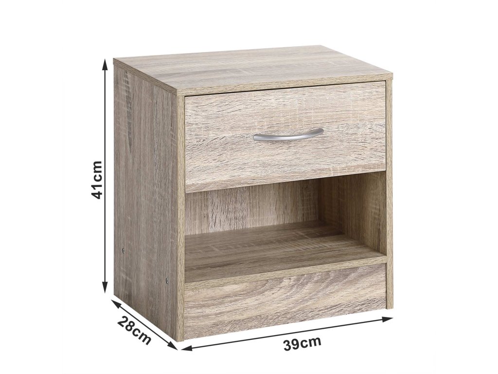 Noční stolek se svými kompaktními rozměrům (VxŠxH) 39 x 28 x 41 cm nezabere mnoho místa ale díky úložnému prostoru a zásuvce s hladkým chodem nabízí dostatek úložného prostoru pro váš budík, vaši oblíbenou knihu nebo jiné osobní věci. Díky své jednoduché eleganci lze noční stolek perfektně kombinovat s jinými kusy nábytku a harmonicky tak zapasovat do jakékoli ložnice Díky praktické výšce 41 cm noční stolek jednoduše zápas ke své posteli.