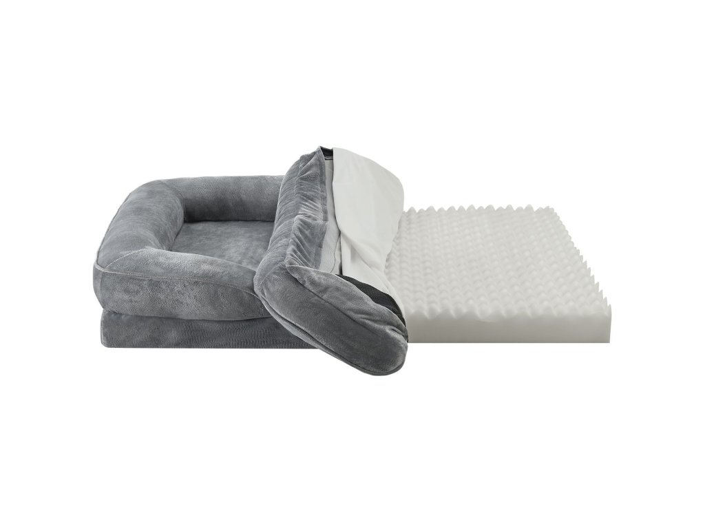 Pohodlný pelíšek pro psa Sheena XL 105x82x17 cm v šedé barvě. Je vhodný pro každodenní použití v interiéru. Na vnitřní ploše 85 x 67 cm mají velké psy do 45 kg dostatek místa pro pohodlné ležení. Matrace se skládá z vysoce kvalitní pěny a ergonomicky se přizpůsobí tělu. Flanelová tkanina je příjemná na dotek, potah je plyšový a hřejivý. Pelíšek zaujme svým elegantním vzhledem a odolností. Díky protiskluzové látkové základně pelíšek bezpečně přilne k podlaze – užitečné na hladkých površích, jako jsou dlaždice a parkety. Potah je odzipovatelný a pratelný při nízkých teplotách.
