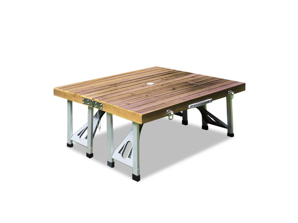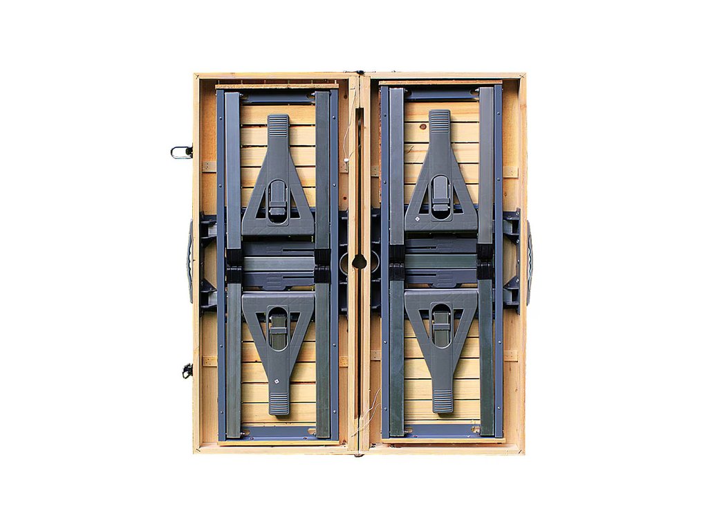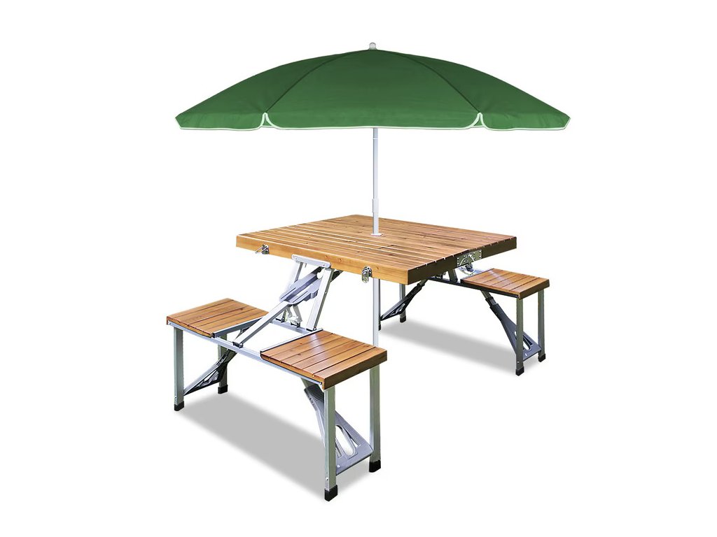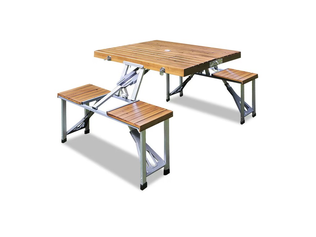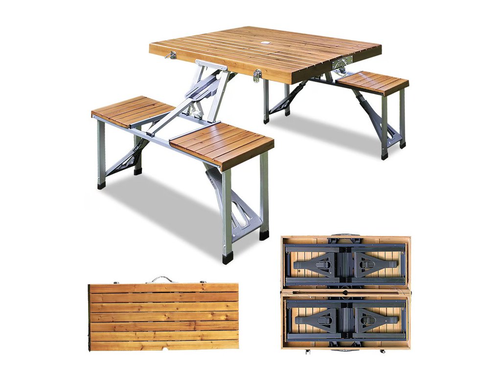 Kempingový set je obzvlášť kompaktní, snadno se přenáší a je velmi stabilní při používání. Díky praktické funkci skládání je ideální na cesty. Integrovaná sedadla nabízejí místo až pro 4 osoby. Výhodou je i otvor na slunečník ve středu stolu. Má všestranné využití, například ke kempování, pikniku, zahradě či balkonu. Set je vyroben z broušeného hliníku.Výhody produktu: