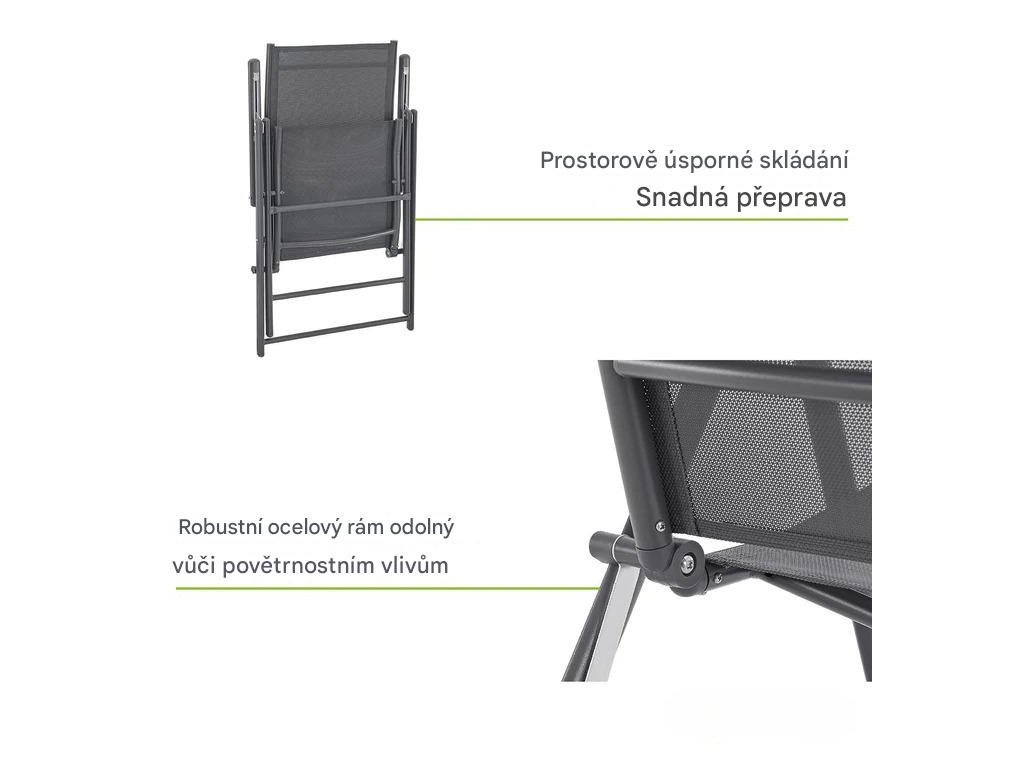 Tyto ergonomicky tvarované křesla nabízejí 7-stupňové nastavitelné opěradlo, díky čemuž si můžete polohu přizpůsobit podle potřeby a dopřát si maximální pohodlí při sezení. Robustní ocelový rám zaručuje stabilitu a spolehlivou oporu i při dlouhodobém používání. Materiál sedáku je prodyšný, což zajišťuje příjemné větrání i během horkých dnů a přispívá k celkovému komfortu. Díky skládacímu mechanismu jsou křesla snadno přenosné a ideální pro použití doma i na cestách.Jejich odolná konstrukce dokáže čelit různým povětrnostním podmínkám a zároveň dodává vašemu exteriéru moderní a stylový vzhled. Na údržbu postačí vlhký hadřík s jemným mýdlovým roztokem, případně měkký kartáček na odolnější nečistoty. Pokud křesla delší dobu nepoužíváte, doporučujeme je skladovat na suchém a chráněném místě, abyste prodloužili jejich životnost a zachovali jejich vzhled i funkčnost.Technické specifikace: