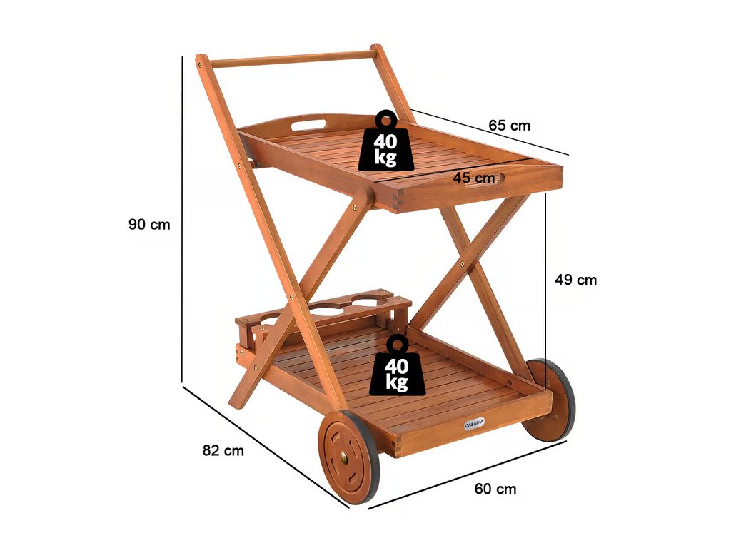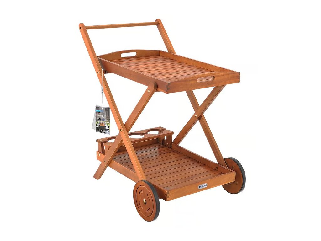 Stylový servírovací vozík se dvěma kolečky poskytuje praktický a mobilní úložný prostor rozdělený do dvou úrovní. Nabízí dostatek místa k servírování čaje, kávy či jídla a díky kvalitním kolečkům jej lze jednoduše přesouvat přesně tam, kde je právě potřebný. Horní část lze v případě potřeby snadno odejmout a použít ji jako samostatný servírovací tác. Spodní úroveň je vybavena praktickými držáky na láhve, do kterých se vejdou až tři láhve. Servírovací vozík je ideálním doplňkem ke grilování nebo zahradní párty a zároveň se elegantně hodí i do interiéru kuchyně či obývacího pokoje.