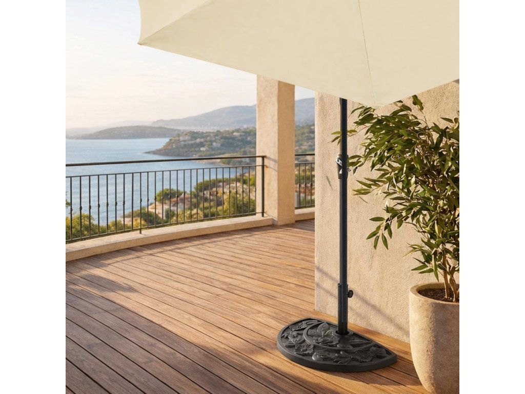 Stojan na slunečník zaujme také svým vzhledem, který připomíná litinové provedení s květinovým vzorem. Dekorativní zpracování dodává výrobku elegantní a nadčasový charakter, takže nepůsobí jen jako praktický doplněk, ale i jako estetická součást balkonu nebo terasy. Černá barva se snadno kombinuje s různými styly zahradního nábytku.