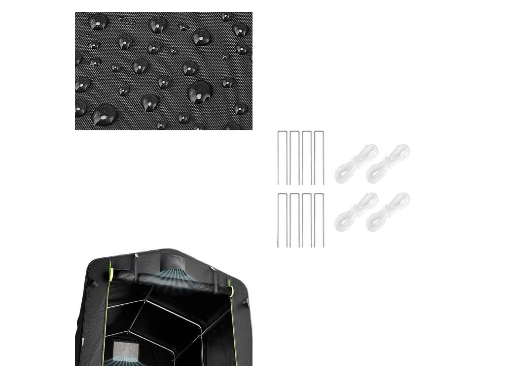 Pro dosažení optimální stability je třeba stan správně upevnit pomocí přiložených napínacích lan a kotvicích prvků. Správná instalace výrazně zvyšuje odolnost vůči větru. Při nepříznivých podmínkách doporučujeme dodatečné zajištění podle konkrétního prostředí.