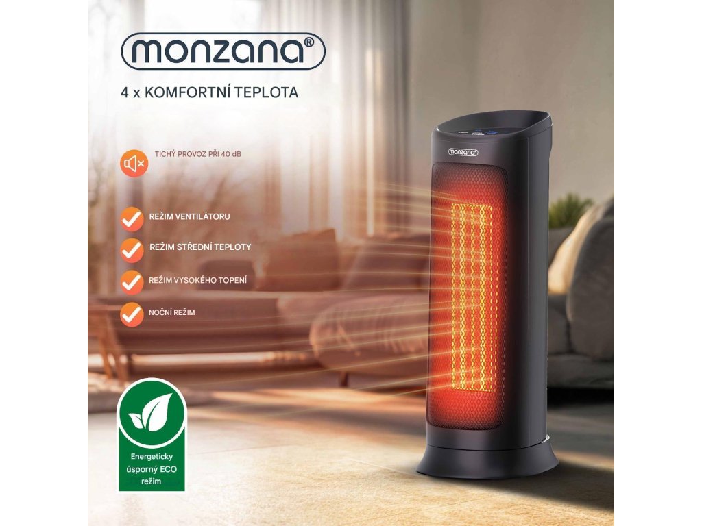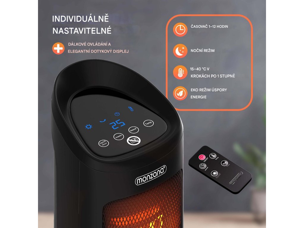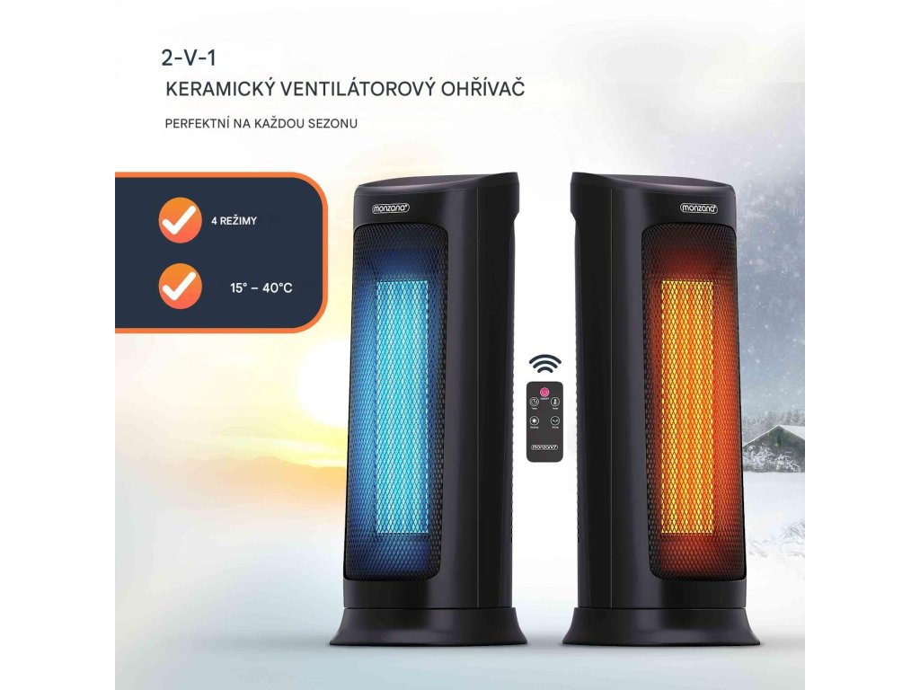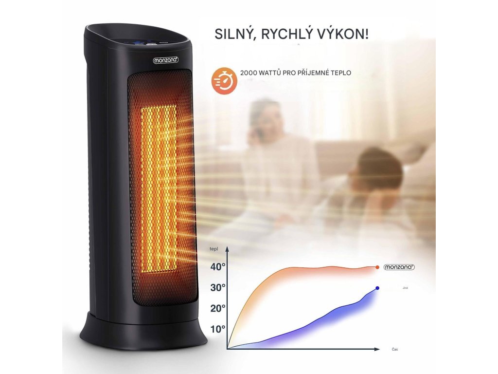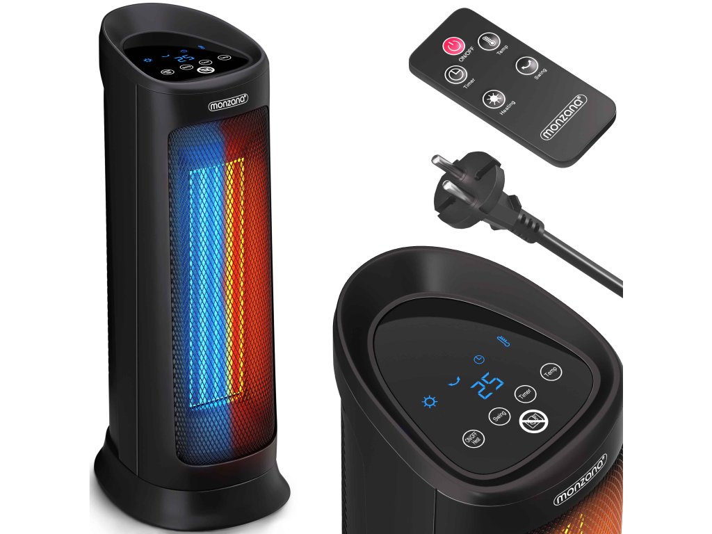 Díky silnému výkonu 2 000 wattů se ohřívač okamžitě postará o příjemné teplo. Ventilátor má 4 různé režimy - režim ventilátoru, střední ohřev, vysoký ohřev a úsporný režim ECO. Uvnitř ohřívače je dvojitý tangenciální ventilátor, který je tichý a efektivní při distribuci vzduchu. Ventilátor má také časovač 1-12 hodin a noční režim. Oscilaci s úhlem 120° lze jednoduše zapnout nebo vypnout. Keramický ohřívač ventilátoru lze ovládat pomocí dálkového ovladače nebo pomocí dotykového displeje, který je umístěn na horní straně zařízení. Robustní kovová mřížka před topným tělesem, jakož i ochrana hrotu a ochrana proti přehřátí zajišťují vaši bezpečnost. Ventilátor lze rychle a snadno přepravovat pomocí integrované rukojeti a kompaktním rozměrům.Výhody produktu: