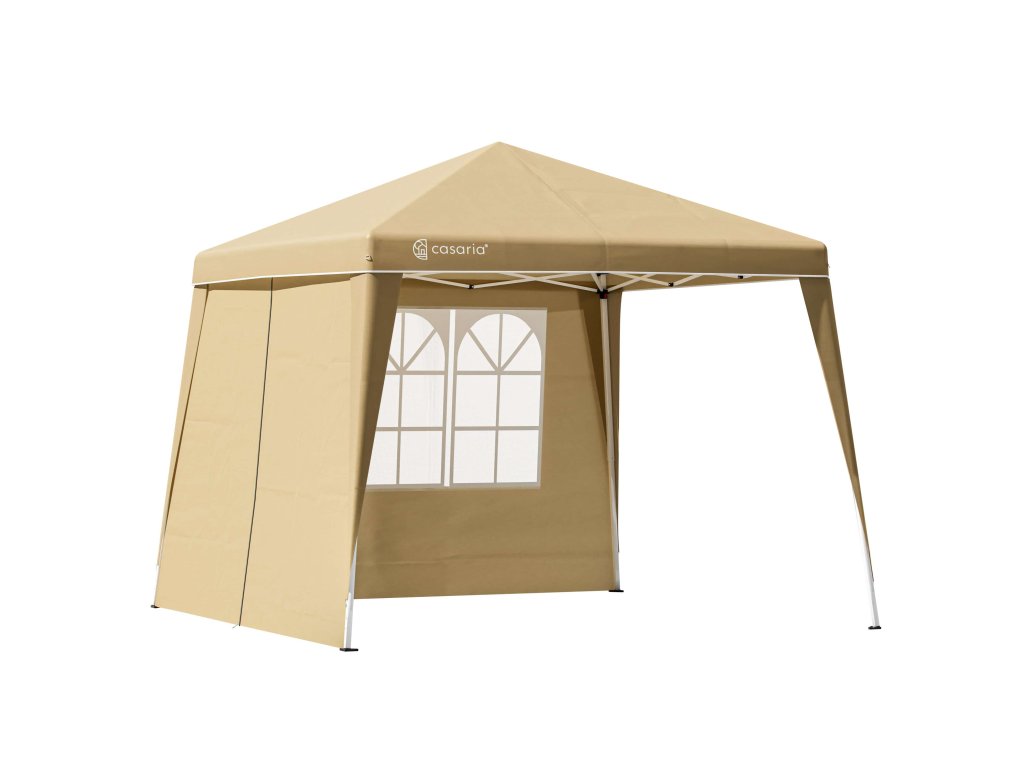 Díky praktickému skládacímu systému lze altán kompletně složit během několika minut. Kovové vzpěry a ukotvitelné nohy dodávají tomuto altánku dobrou stabilitu. Praktické boční stěny lze rychle a jednoduše připevnit k vašemu altánku. Střešní krytina a 2 boční panely jsou vyrobeny z kvalitní 220D Oxford tkaniny s PVC zátěrem, které jsou vodoodpudivé a poskytují UV ochranu 50+. Výška je variabilní, protože nožičky jsou nastavitelné. V případě potřeby můžete stěny altánu jednoduše uzavřít nebo přivázat pomocí upevňovacích popruhů. Praktické boční stěny lze přitom snadno připevnit pomocí suchých zipů. Jedna boční stěna disponuje 3-dílným oknem, zatímco druhá má zip. Neposkytuje ochranu při bouřích nebo špatných povětrnostních podmínkách.