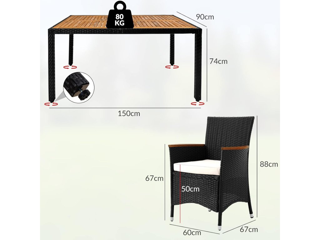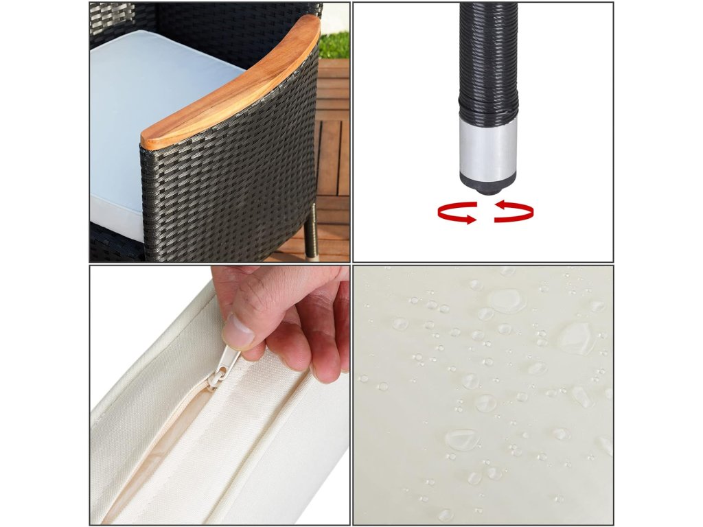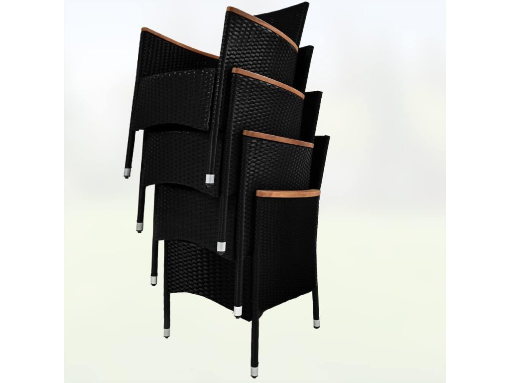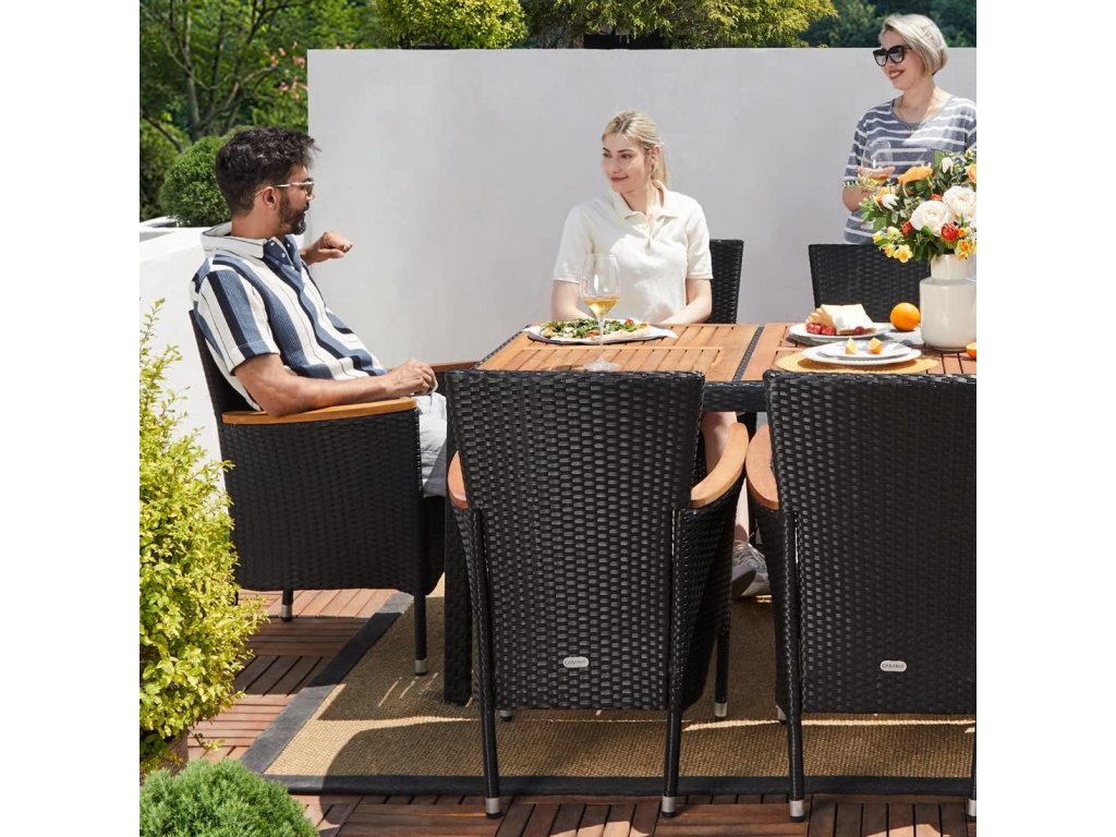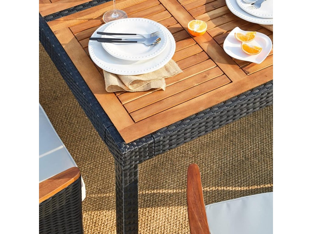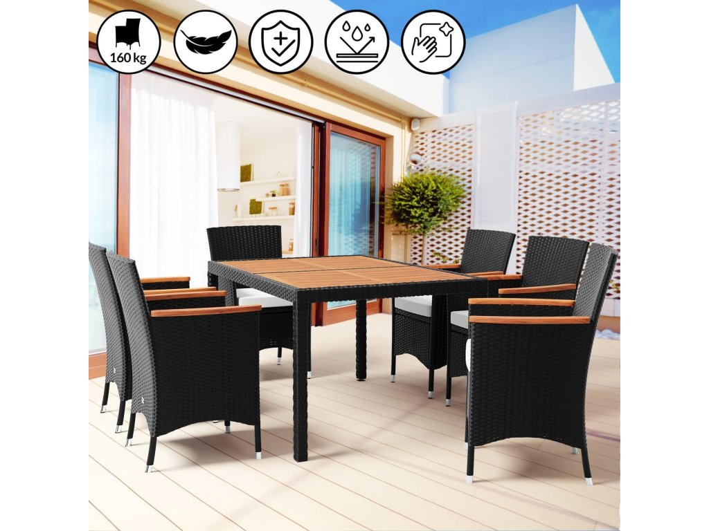 Zahradní sestava z ručně pleteného polyratanu, odolného vůči povětrnostním podmínkám, obsahuje stůl a šest stohovatelných zahradních křesel. Stolní deska, jakož i područky jsou vyrobeny z masivního akátového dřeva a dodávají zahradní soupravě osobitý šarm. Potahy na podsedácích jsou vodoodpudivé, takže tekutiny nevsakují okamžitě a lze je snadno otřít. V případě potřeby lze potahy díky zipům snadno sundat a vyprat při 30°C. Nohy stolu a křesel jsou vybaveny výškově nastavitelnými nožičkami, které zajišťují stabilitu i na nerovných površích.