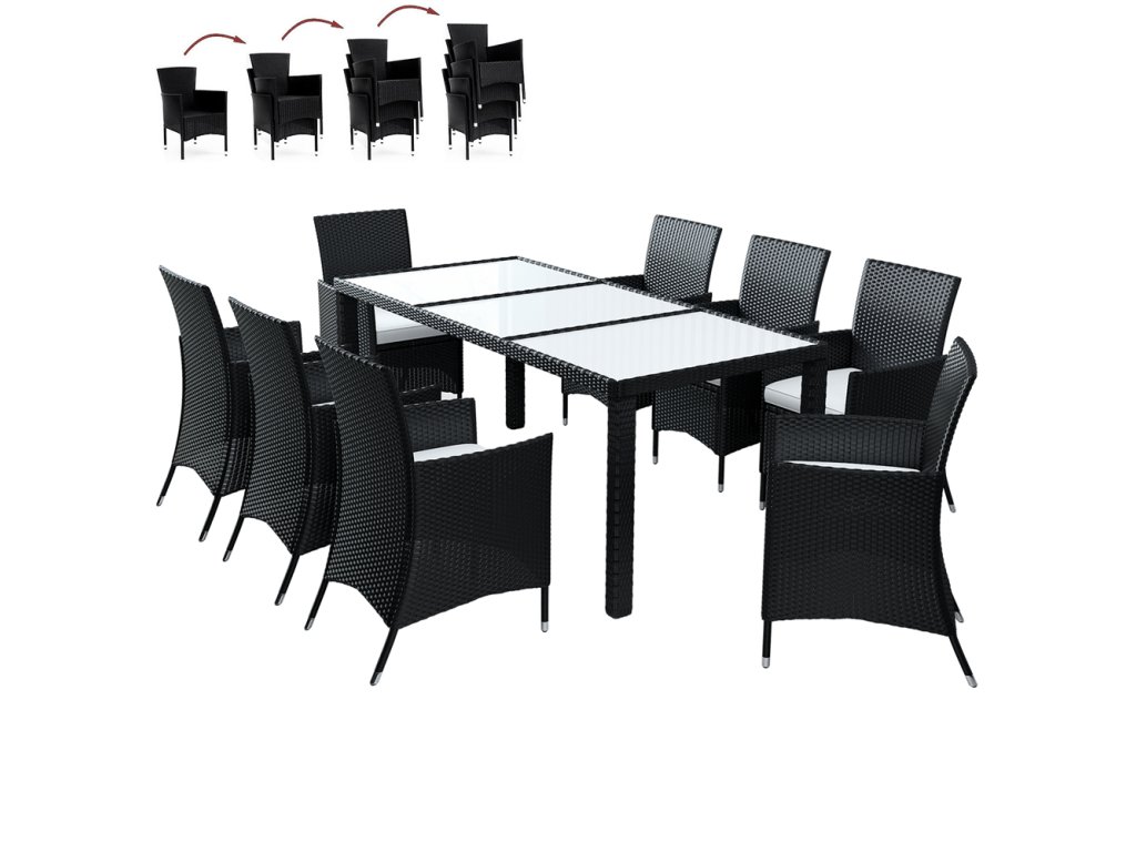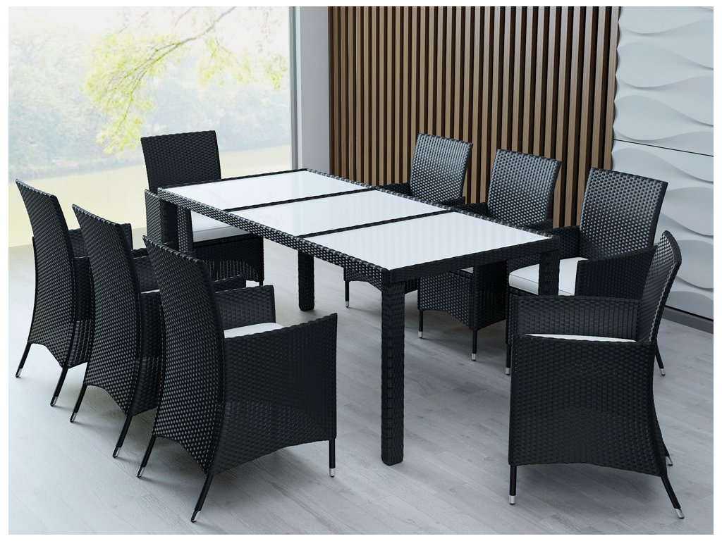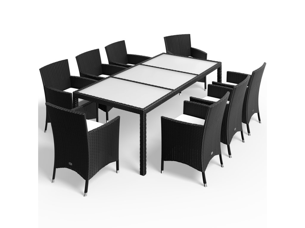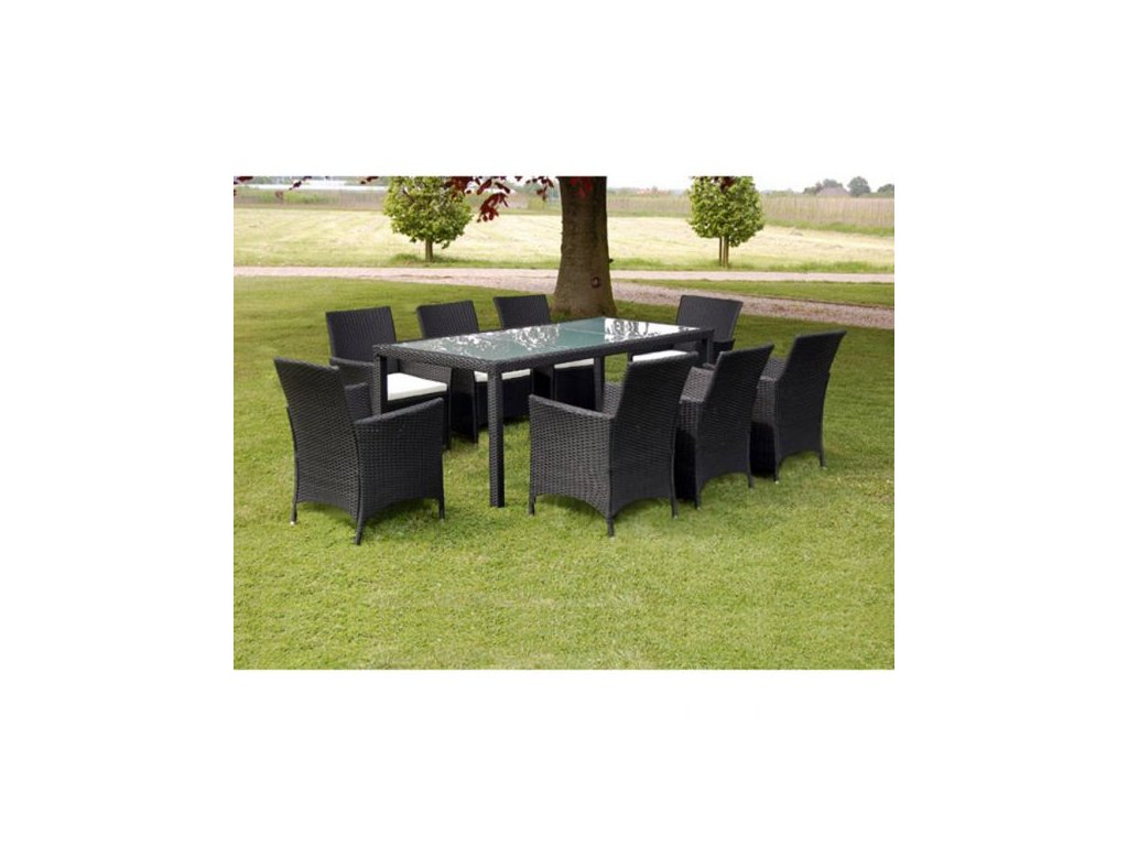 Tento ratanový set zahradního nábytku, sestávající z 1 stolu, 8 křesel s odnímatelnými poduškami. Sestava je vyrobena z polyratanu. Polyratan byl speciálně vyvinut pro zahradní nábytek. Je odolný vůči povětrnostním vlivům a snadno se čistí. Potahy podušek mají praktický zip a při silném znečištění lze sundat a vyprat. Nohy stolu a židle jsou vybaveny vyrovnávacími šrouby pro vyrovnání nerovných ploch.
