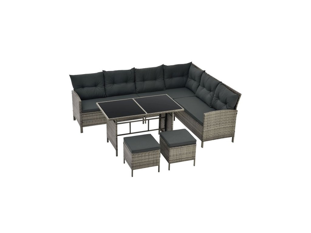 Se sedací soupravou Manacor z polyratanu proměníte svou zahradu, terasu nebo balkon ve stylové místo k odpočinku. Velký zahradní set s rohovou pohovkou, 2 taburetky a stolem má kapacitu až pro 7 osob. Měkké sedáky a opěrky zajišťují pohodlné sezení. Jedinečný ratanový vzhled dodává zahradnímu setu moderní šarm. Díky stolové desce o rozměrech 116 x 66 cm nabízí prostorný jídelní stůl dostatek místa pro stolování nebo společenské hry. Černé bezpečnostní sklo o tloušťce 5 mm je robustní a snadno se čistí. Souprava má základní konstrukci z několikanásobně vyztužené oceli. Robustní ocelový rám dává sedací soupravě bezpečnou oporu. Rám je dobře chráněn proti korozi, díky rozsáhlému práškovému lakování. Polyratan je obzvláště rozměrově stabilní materiál - robustní, odolný proti roztržení a také odolný vůči UV záření. Síťka odolává dešti, nízkým teplotám a intenzivnímu UV záření. Vysoká elasticita umožňuje pohodlné sezení i bez polštářů. Podušky o tloušťce 5 cm vám umožní pohodlné sezení. Potahy podušek jsou odnímatelné a při silném znečištění je lze vyprat na 30 stupňů. Potahy zadních polštářů nejsou odnímatelné a proto je nelze prát.