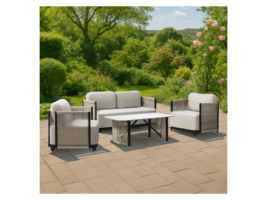 Vysoce kvalitní sada Curacao zaujme svým moderním designem a výjimečným pohodlím. Konstrukce z práškově lakovaného hliníku vyniká svojí pevností a spolehlivou ochranou proti korozi. Dekorativní deska ze slinutého kamene, známá svojí vynikající odolností, nabízí ideální ochranu před poškrábáním, teplem a vlhkostí. Potahy vyrobené ze 100% olefinu jsou voděodolné, rychleschnoucí a nenáročné na údržbu.Technické specifikace: