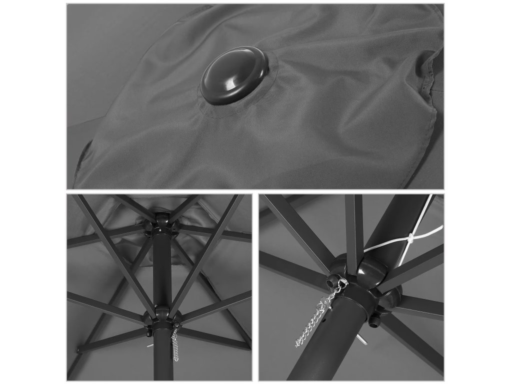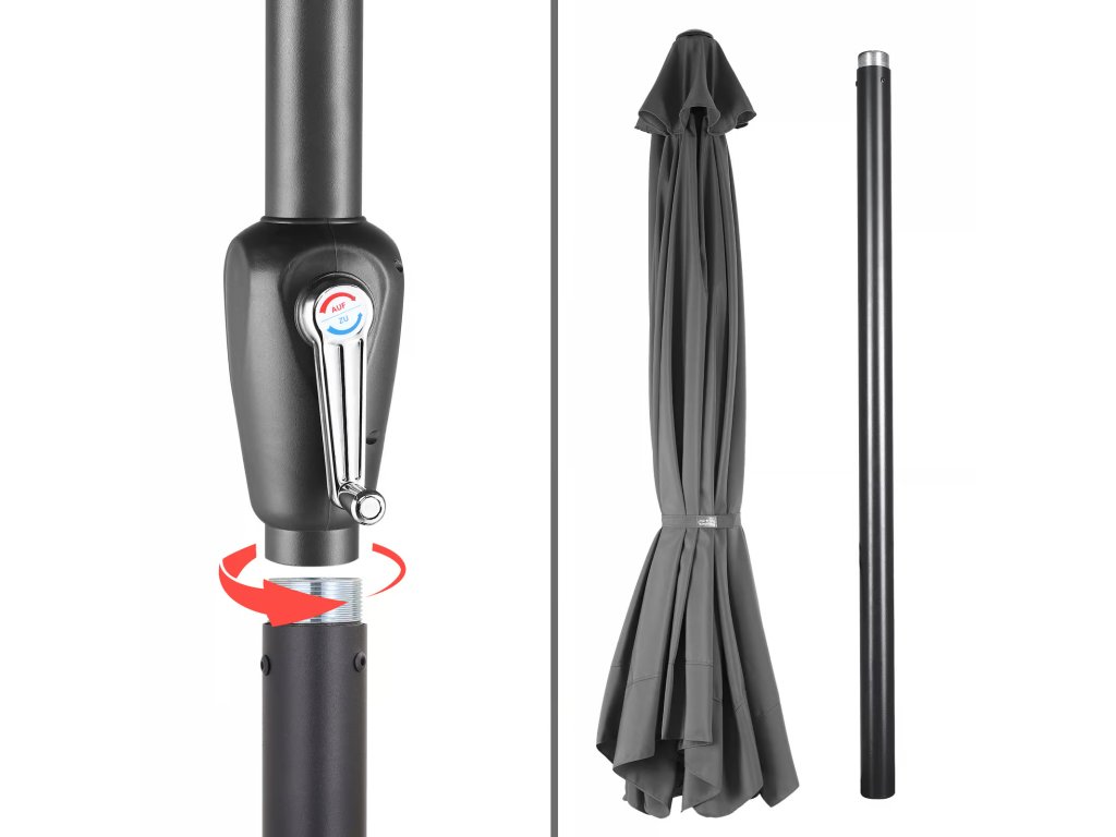 Tyč slunečníku je vyrobena z hliníku, díky čemuž je pevná a zároveň snadno ovladatelná. Tyč lze snadno rozdělit na dvě části, což usnadňuje skladování a přepravu. Stabilitu zvyšují vysoce kvalitní konstrukční výztuhy.
